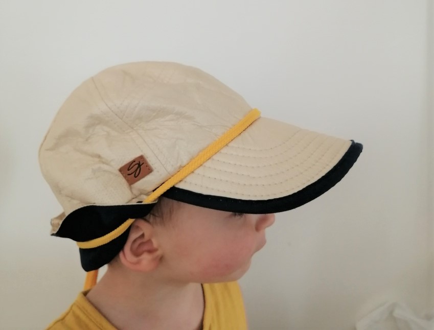 Enfin une jolie casquette avec protège-nuque. Celui-ci se soulève à l’aide d’une pression et se rabat afin d’éviter les coups de soleil dans le cou et sur les oreilles